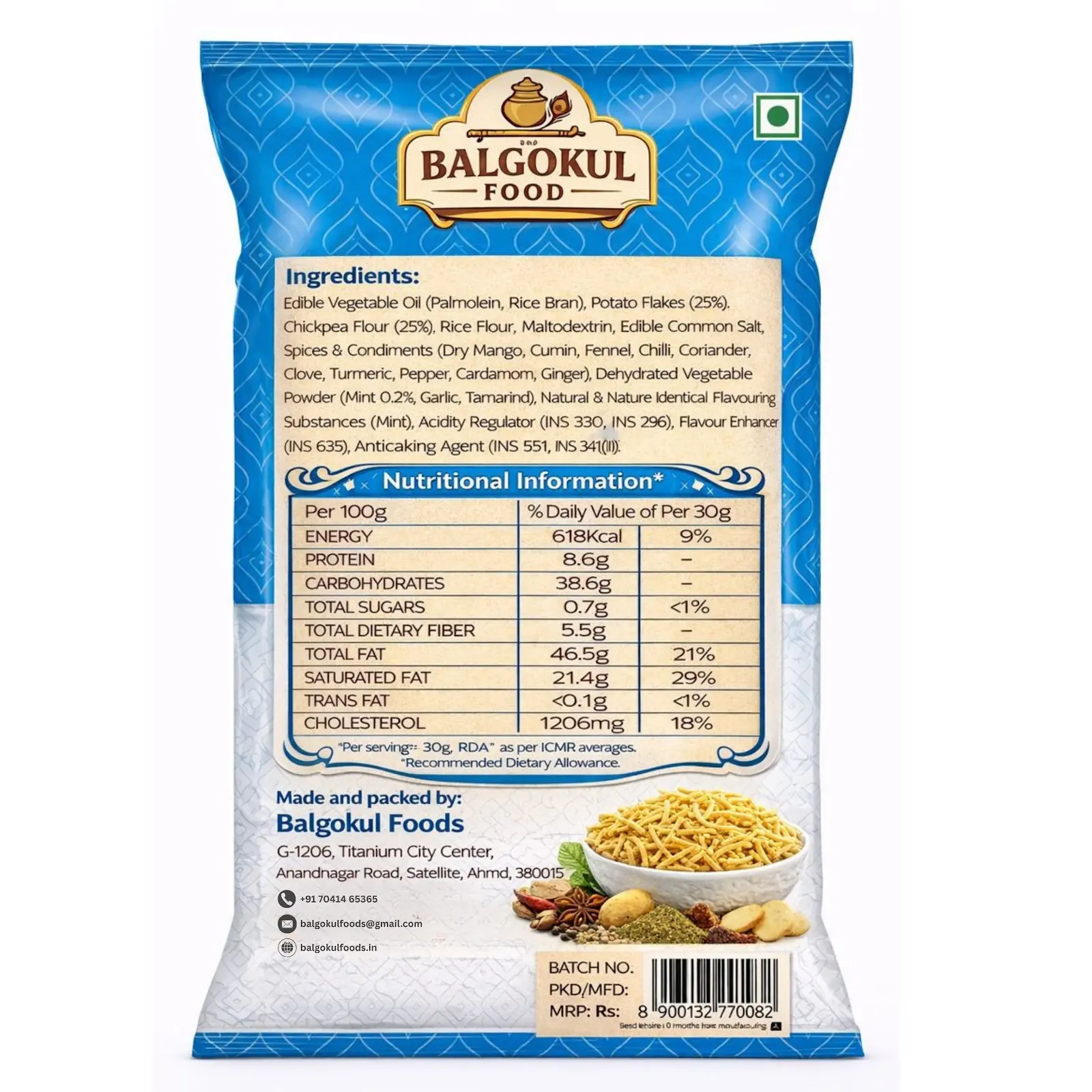 Prepared under hygienic conditions and 100% vegetarian, this product reflects BalGokul Foods’ commitment to quality, consistency, and trusted taste. Ideal for tea-time munching, festive platters, or as a crunchy topping for chaat and snacks.