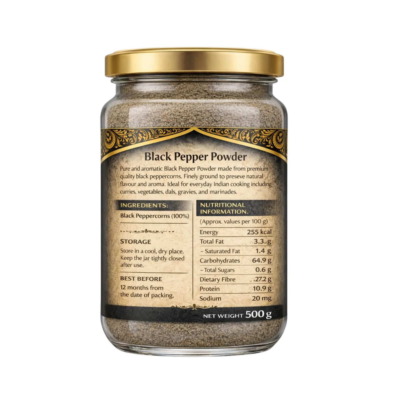 BalGokul Foods Black Pepper Powder is prepared from carefully selected premium black peppercorns and finely milled to preserve its pungency and aroma. Commonly used to enhance curries, vegetables, soups, dals, gravies, marinades, and salads, it adds a bold, spicy kick to every dish. Hygienically packed to maintain freshness and purity.
