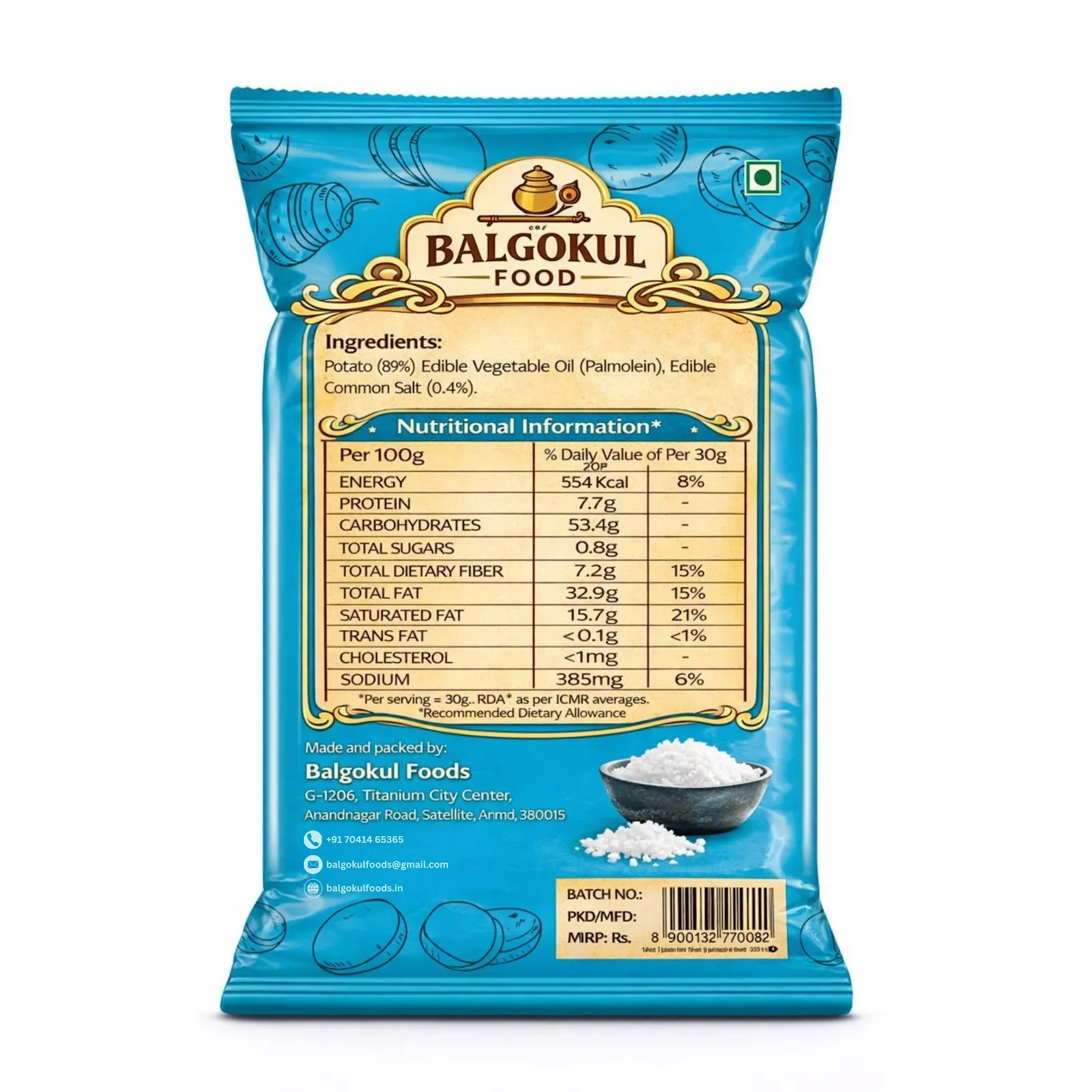 Experience the authentic taste of tradition with BalGokul Foods Salty Masti Wafer. Made from high-quality potatoes and lightly seasoned with just the right amount of salt, these wafers deliver a clean, classic, and satisfying crunch in every bite.